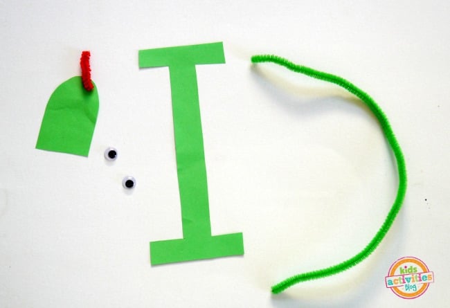 Preschoolers can either draw the letter I shape themselves or use our letter I template. Our favorite part of this letter craft is attaching the pipe cleaners and paper to make an iguana!