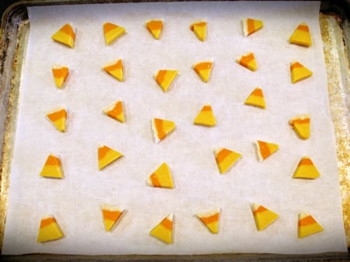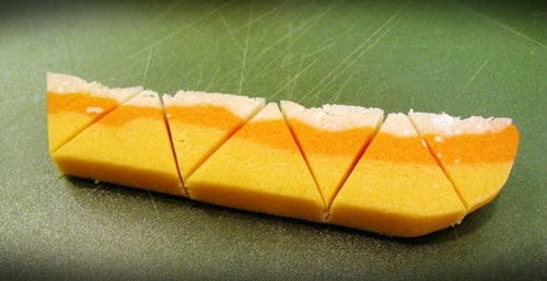 Cut each slice into triangle – each triangle looks like a piece of candy corn!