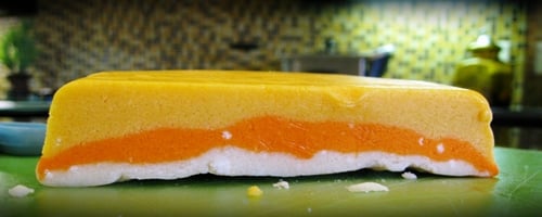 Press yellow dough into bottom of pan, followed by orange dough & white dough.
