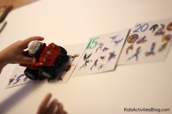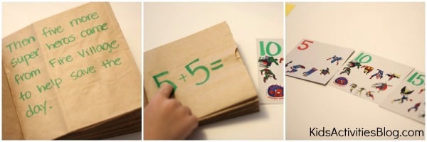 This week I decided to take my son’s newest obsession (superheroes) and use them as we create a simple story that taught him about number sentences and skip counting by fives.