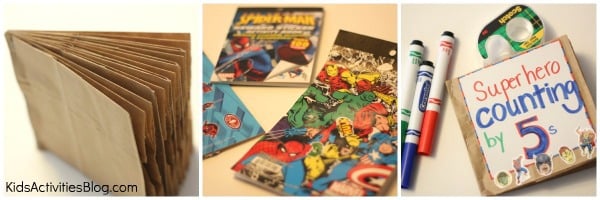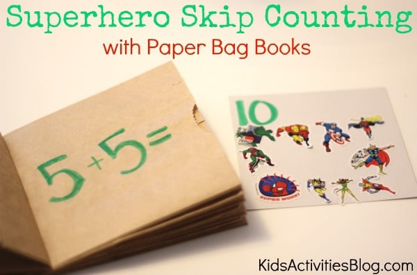 Make a simple paper bag book to help your child learn skip counting in a hands-on way the super hero way! This math activity is great for kids learning the basics of skip counting playfully. Use this skip counting paper bag book at home or in the classroom.